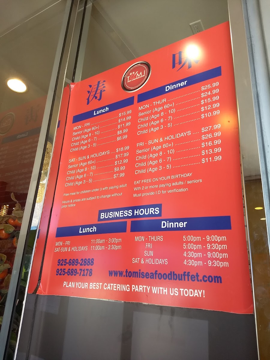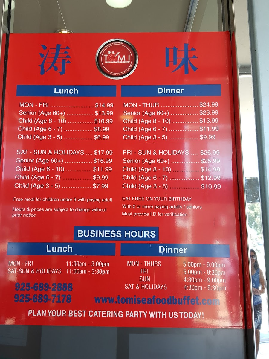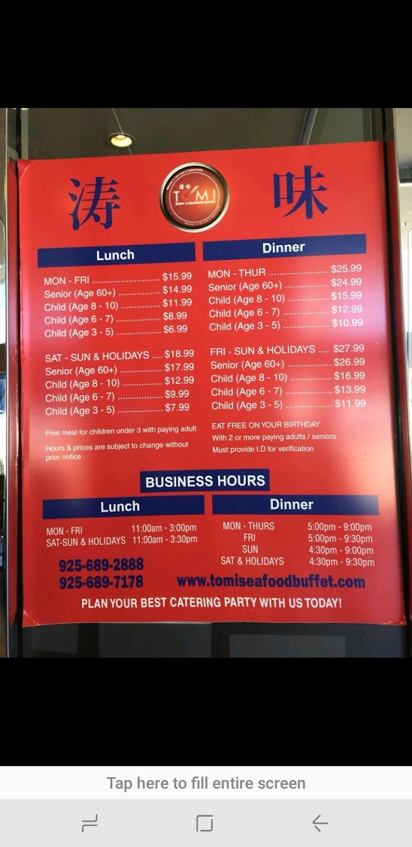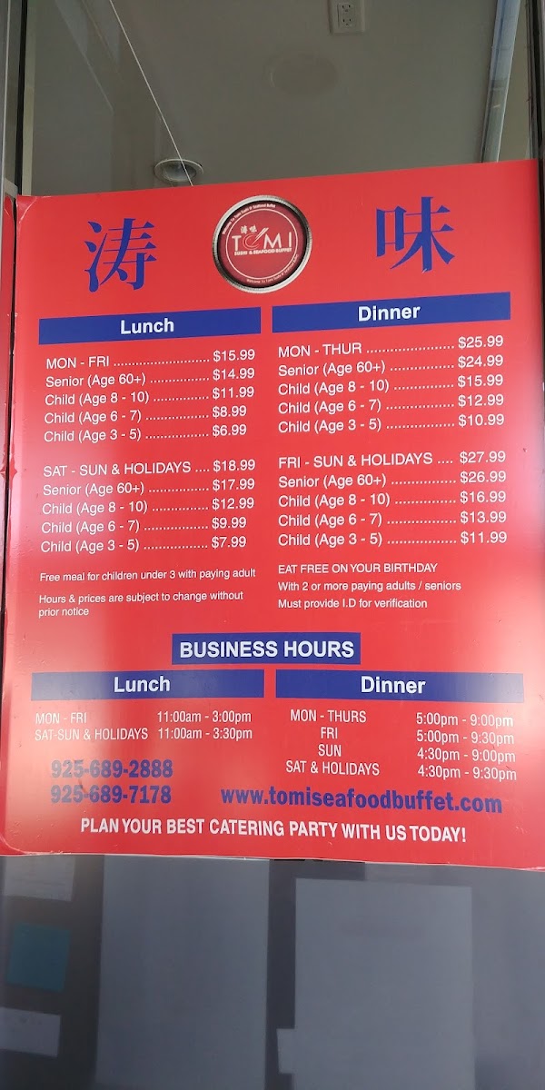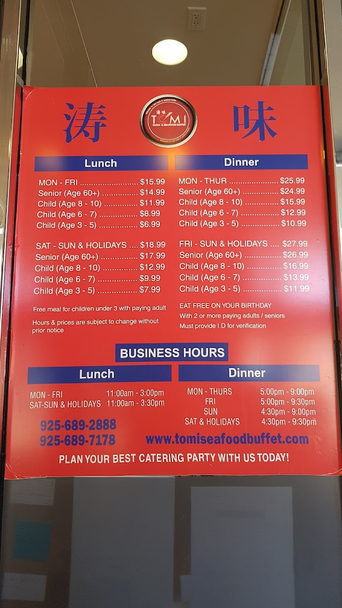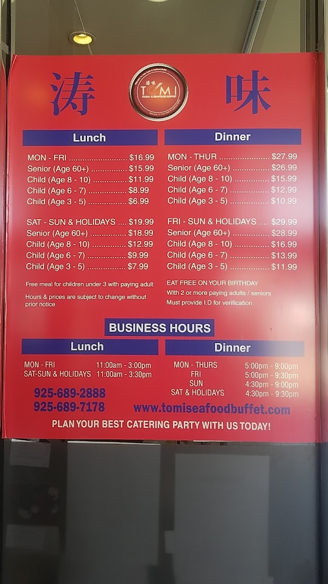 The menu at Tomi Sushi and Seafood Buffet primarily features an extensive buffet selection focused on sushi, seafood, and a variety of Chinese food options. The buffet format allows guests to sample multiple dishes in a single visit, accommodating those looking for casual dining or an all-you-can-eat experience.